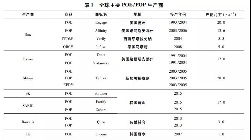 2020年全球POE消费量已超过120万吨,产能超100万吨,主要的供应商有陶氏公司(Dow)、Mitsui、SNNC(SK与SABIC联营)、LG、ExxonMobil和Borealis。