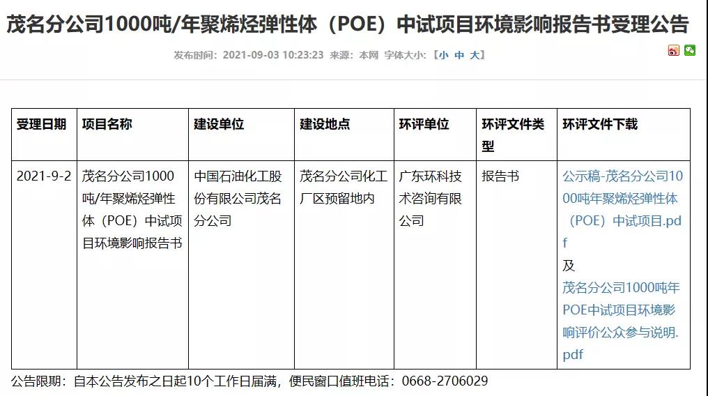中国石油化工股份有限公司茂名分公司9月3日,茂名市生态环境局在官网公布了《茂名分公司1000吨/年聚烯烃弹性体(POE)中试项目环境影响报告书》受理公告。