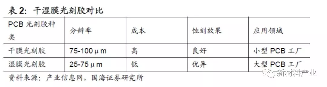 1.1、 PCB光刻胶分为干膜、湿膜光刻胶与光成像阻焊油墨,湿膜性能优于干膜